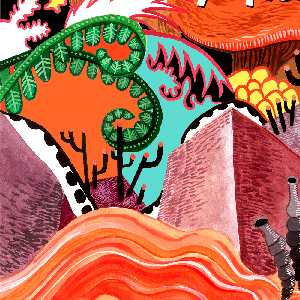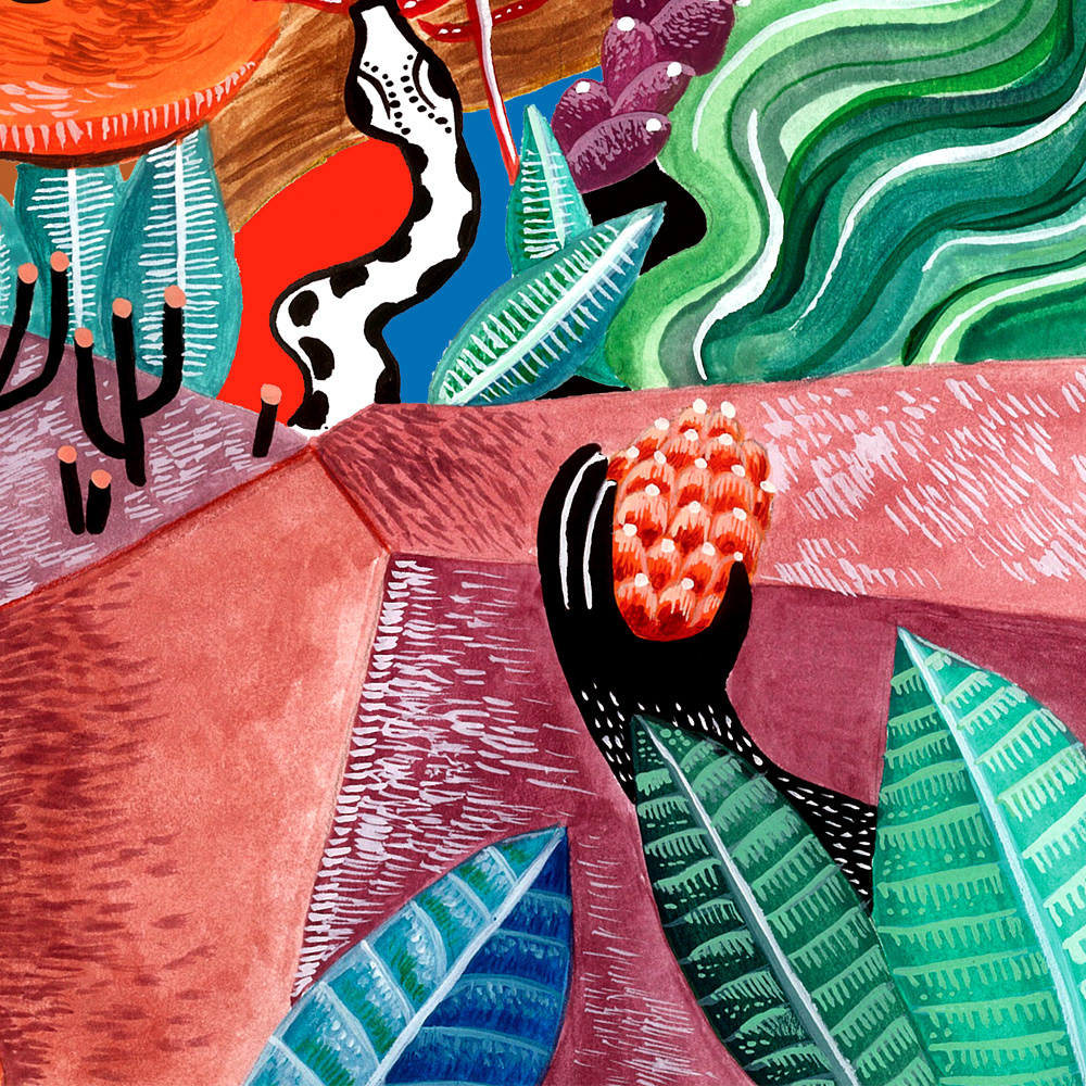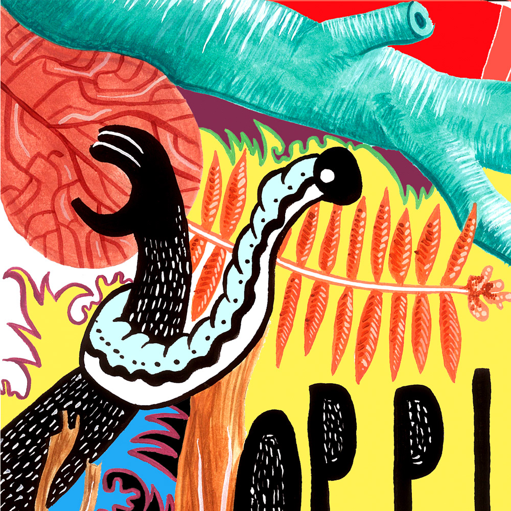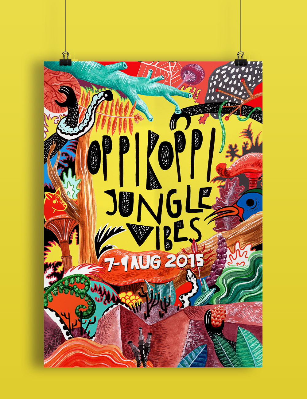 An illustrated poster for a South African music festival called Oppikoppi. The brief specified that the theme should be 'Jungle Vibes'. The poster was painted in gouache an completed in Photoshop.